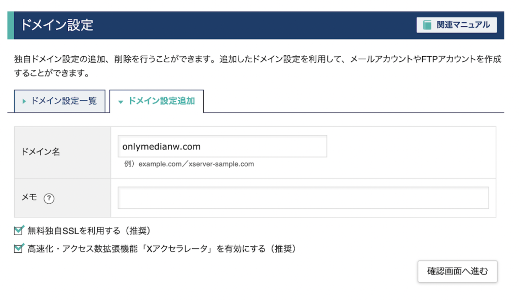 「ドメイン設定追加」画面の「ドメイン名」欄に、先ほど取得したドメインネームを入力して、「確認画面へ進む」をクリックして完了です。この際、「無料独自SSLを利用する」と「高速化・アクセス数拡張機能〜」はチェックをいれたままにしておきます。