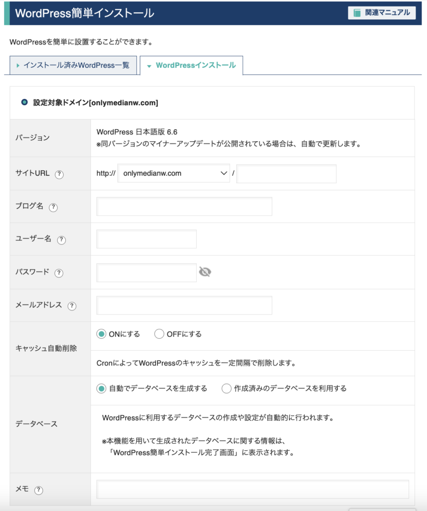 「Wordpressインストール」画面で、サイトURLを確認し、以下の項目を入力します。(URLの「/」以降は空白にします)