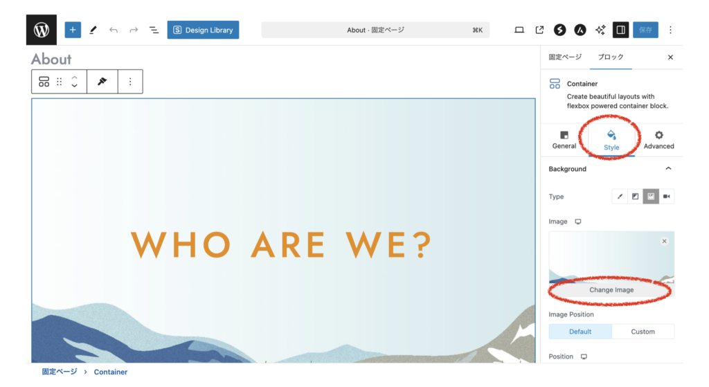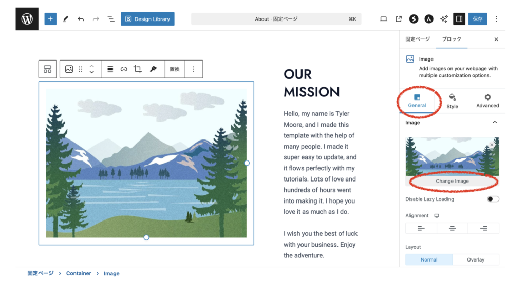 画像の差し替えは、もうおわかりですね。トップページと同様に、変更したい画像をクリック。右側の「ブロック」エリアの「General」または「Style」に表示される「Change Image」> メディアライブラリーで画像を「選択」します。