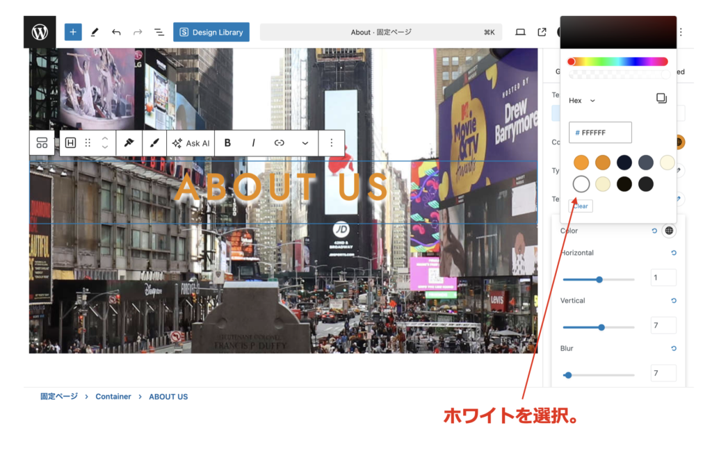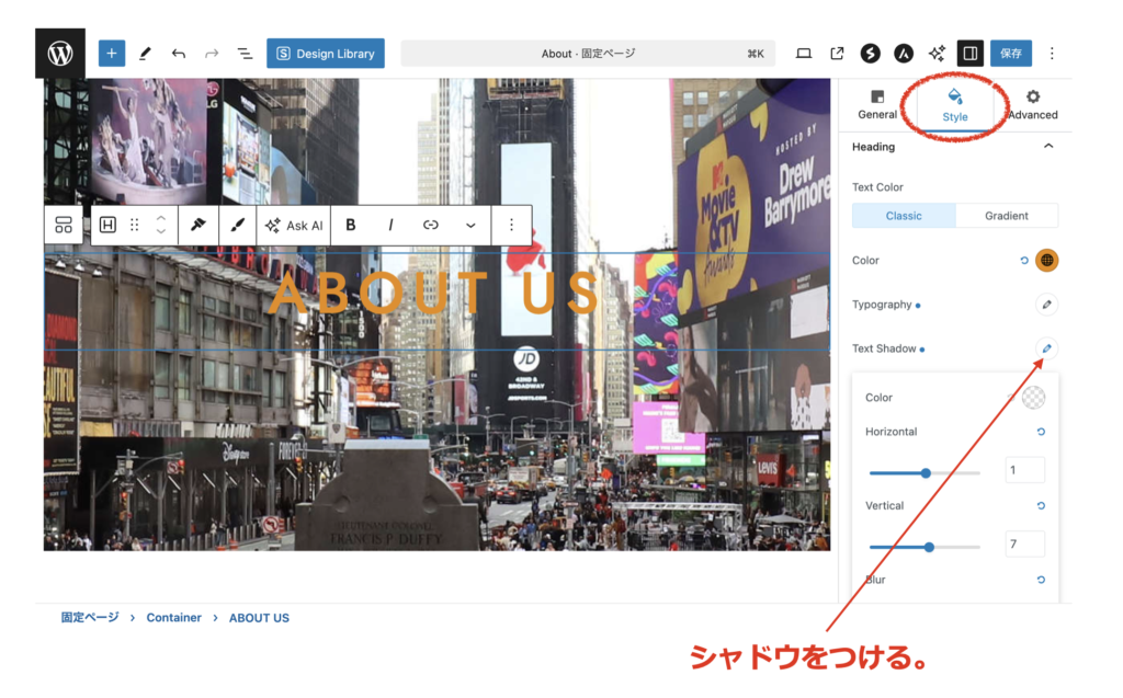 ABOUT USの文字を選択して、右側の「ブロック」> 「Style」> 「Text Shadow」をクリック。デフォルトではShadowが透明色になっていますので、ホワイトカラーを選択します。Horizontal、Vertical、Blurの値を見えやすいように変えたら出来上がりです。